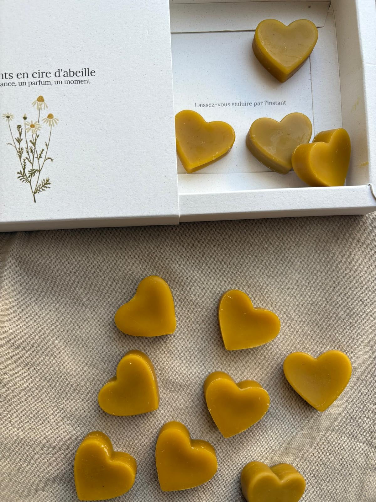 Il contient un brûle-parfum en porcelaine, façonné à la main par une céramiste de notre quartier, des fondants en forme de cœur au miel et aux parfums de Grasse (Balade en forêt, Bergamote & Menthe, Figue), ainsi que deux boîtes de tealights au soja et à la cire d’abeille.