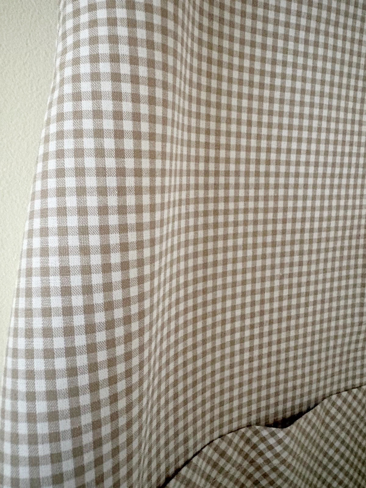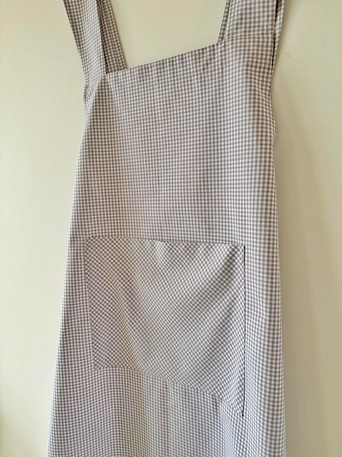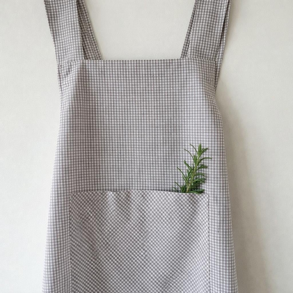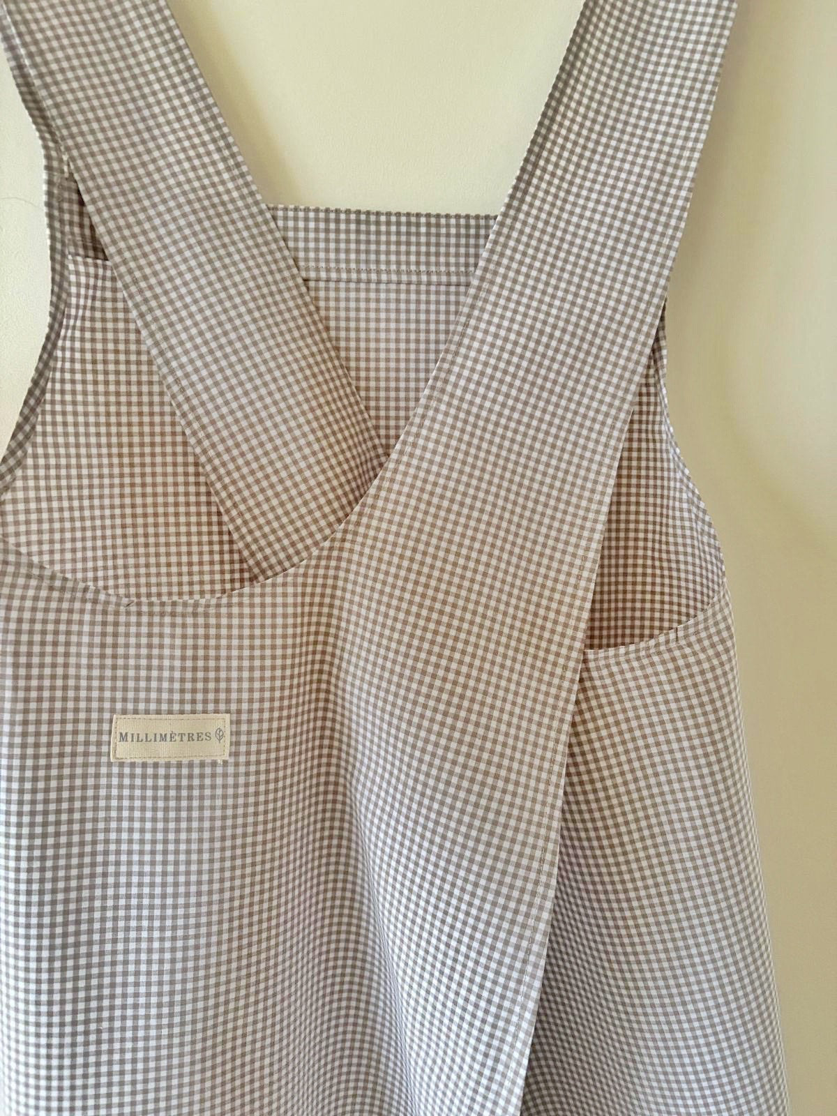 Tablier japonais en vichy beige, réalisé dans une popeline fine et douce de haute qualité, 100 % coton.